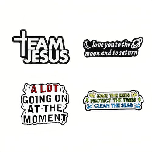 Material: Liga Tamanho: 3-4,5 x 1,5 a 2,7 cm Peso: 14 g Quantidade: você receberá todas as peças em quantidade igual à primeira foto principal Mostrar design exclusivo de letras Apresenta estilos criativos de palavras e frases, como “Equipe Jesus”, “Te amo até a lua e Saturno” e slogans ecológicos, adicionando personalidade às suas roupas. Material de liga premium Feitos de liga durável com acabamento em esmalte fino, esses broches são leves, resistentes ao desgaste e mantêm sua aparência vibrante ao longo do tempo. Inspirador e divertido Cada emblema transmite um clima ou uma mensagem diferente, tornando esses alfinetes de blusa não apenas elegantes, mas também acessórios significativos para uso diário ou encontros casuais. Opções versáteis de alfinetes de lapela StylingPerfect para roupas, mochilas, chapéus ou jaquetas, adequadas para homens e mulheres que gostam de peças de moda ousadas. Compactos e fáceis de usar Com tamanhos que variam de 3 a 4,5 x 1,5 a 2,7 cm e pesam cerca de 14 g, esses broches são fáceis de transportar e usar, dando um toque final moderno a qualquer roupa.