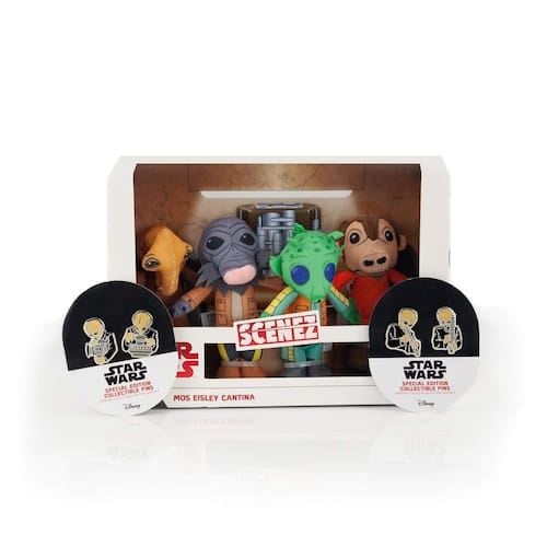 - Exibição coletiva: personagens de pelúcia de 10 cm vêm posados em um diorama que recria o bebedouro de Mos Eisley na Tattoine!