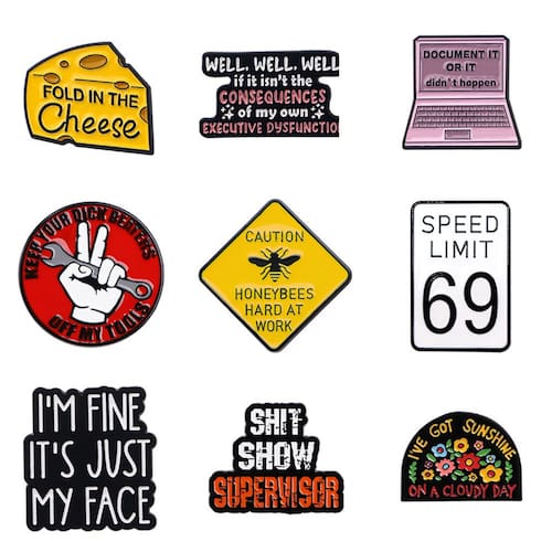 Material: liga Tamanho: 2,9 x 2,9 cm Peso: 50 g Quantidade: você receberá todas as peças em quantidade igual à primeira foto principal. Mostre designs de citações humorísticas. Apresenta broches com citações criativas, como fatia de queijo, laptop, sinal de advertência, limite de velocidade e frases florais, adicionando humor e individualidade às roupas. Construído em liga durável Feitos de liga resistente com acabamento esmaltado, esses alfinetes de blusa são resistentes ao desbotamento, arranhões e deformações, garantindo o uso a longo prazo. Acessório versátil: crachás de lapela perfeitos para decorar jaquetas, camisas, bolsas, mochilas ou chapéus, tornando-os ótimos acessórios modernos para uso diário. Moderno e expressivo. Ideal para estudantes, amantes da moda ou qualquer pessoa que goste de mostrar personalidade e humor com broches de esmalte exclusivos. Compacto e leve Cada pino mede cerca de 2,9 x 2,9 cm e pesa apenas 50 g, é fácil de transportar e confortável para uso diário.