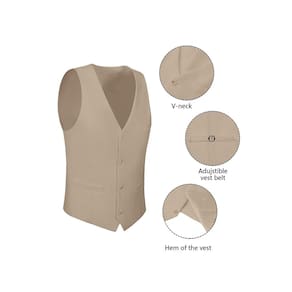 - CARACTERÍSTICA: 5 botões, 2 bolsos no colete, 4 bolsos na calça, ajuste regular, cor lisa e cinto traseiro ajustável