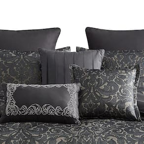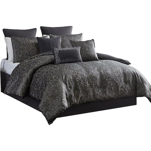 Conjunto de edredom king size de poliéster Benjara Pixie de 9 peças, padrão damasco, cinza carvão
