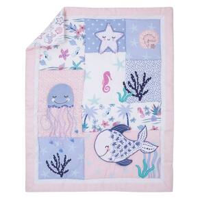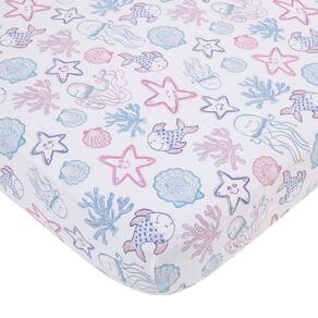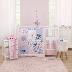 Conjunto de roupa de cama de berçário NoJo Mermaid Lagoon rosa, azul e branco Undersea Friends de 4 peças — edredom, lençol de berço, saia de berço e estojo de armazenamento — O conjunto de roupa de cama de berço de 4 peças inclui edredom, lençol de algodão com elástico, saia de berço e estojo de armazenamento — Apresenta vários amigos do mar em tons de rosa, azul e branco — Elástico nas bordas do lençol com elástico para um cofre e ajuste confortável — Inclui tudo o que você precisa para uma aparência coordenada — Lavável à máquina para facilitar o cuidado