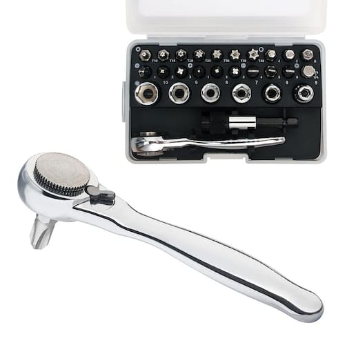 SHARDEN Conjunto de chaves de fenda de ângulo reto de 1/4, 28 peças, chave de fenda de ângulo reto e broca com conjunto de soquete métrico, chave de catraca pequena de 72 dentes, chave de fenda deslocada de perfil baixo para espaços apertados - ?Ideal para espaços apertados?O conjunto de mini catraca Sharden foi projetado para pontos apertados onde uma chave de fenda tradicional não caberia. A catraca curta tem 9,3 cm de comprimento e 1,2 cm de espessura, pequena o suficiente para alcançar espaços confinados, dá a você a folga aprimorada que você precisa, ajuda a girar os parafusos facilmente. Este pequeno conjunto de catraca também inclui uma extensão de chave de 5,8 cm que é ótima para trabalhar em áreas difíceis de alcançar - ?Design profissional?O mecanismo de catraca reversível de 72 dentes da catraca só precisa de arco de balanço de 5 graus para operar enquanto mantém o torque máximo. A direção do motorista pode ser alterada suavemente com um toque do interruptor de polegar na parte traseira da cabeça da catraca sem remover a mini chave do fixador. E o suporte magnético permite trocas rápidas de bits para melhorar a eficiência e o desempenho - ?Aplicações comuns?Esta catraca de baixo perfil contém mini soquete (5 mm-10 mm) e uma ampla variedade de pontas (Torx Security, Hex, Phillips, Pozidriv, Cabeça chata) para concluir a maioria das tarefas. Portanto, esta chave de fenda é imbatível para qualquer pessoa que trabalhe em equipamentos com fixadores difíceis de alcançar como eletrônicos, eletrodomésticos, motores, máquinas elétricas, industriais, armeiro, maçanetas de porta, máquinas de costura e mais - ?Qualidade premium?O conjunto de catraca pequeno SHARDEN é projetado com material de qualidade premium para resistência e durabilidade para uma ferramenta que você vai usar várias vezes. A chave de catraca 1/4 é feita de qualidade com liga de aço com um acabamento polido espelhado para resistir à corrosão e limpar facilmente. As pequenas soquetes e as brocas de 0,63 cm são feitas de aço cromo-vanádio para uma forte dureza que reduz o desgaste - ?Portátil e confiável?Um estojo de ferramentas compacto e resistente moldado por sopro está incluído com compartimentos designados e tamanhos impressos para cada broca e soquete, ajudando você a ficar sempre arrumado, organizado e preparado. Este conjunto de chaves de fenda angular é coberto pela garantia vitalícia da Sharden e 30 dias de devolução do dinheiro. Se você tiver algum problema, não hesite em nos contatar através da Amazon, faremos o nosso melhor para ajudar cada cliente