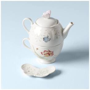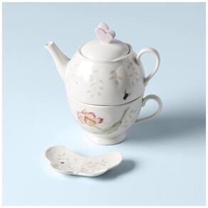 Este conjunto de chá de 3 peças para uma pessoa apresenta um design empilhável, prático e elegante. O bule, que comporta 530mL, a xícara, com capacidade para 350mL e o suporte para saquinhos de chá, com 8 cm de comprimento, são feitos de porcelana branca fina, decorados com flores delicadas, borboletas esvoaçantes e joaninhas. O bule é ainda mais encantador com uma borboleta rosa claro como alça superior, adicionando um toque especial.