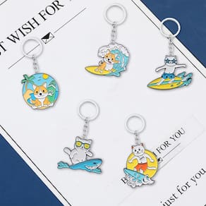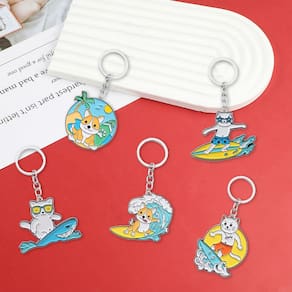 Material: liga de zinco Tamanho: 3,8 cm Peso: 30 g Design divertido de surfe — Cada chaveiro apresenta cães e gatos adoráveis surfando em ondas coloridas, trazendo uma atmosfera alegre de praia de verão aos seus acessórios. Material de liga de zinco durável — Feito de liga de zinco de alta qualidade, garantindo cor, brilho e resistência duradouros à ferrugem ou ao desbotamento, mesmo com o uso diário. Tema vibrante do oceano — inclui cinco padrões exclusivos de pranchas de surfe em cores vivas, perfeitos para amantes do oceano, surfistas e aqueles que gostam de designs divertidos de animais. Decoração multiuso — Adequada para chaves, bolsas, mochilas e interiores de carros; adiciona um toque de criatividade e personalidade aos itens do dia a dia. Perfeito para todas as idades — Um acessório fofo e moderno, ideal para homens e mulheres que apreciam detalhes em estilo cartoon e estética com tema de praia.