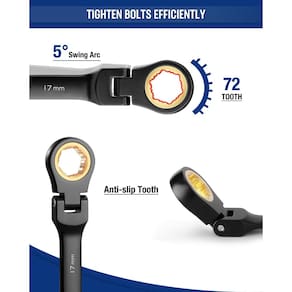 WORKPRO Conjunto de chaves combinadas de catraca, conjunto de chaves antiderrapantes de cabeça flexível de 8 a 17 mm, 72 dentes, construção Cr-V, revestimento eletroforético preto com bolsa de rolamento - O design de dente antiderrapante com catraca mantém a cabeça da chave apertada, sem escorregar e balançar, aumentando a propriedade antiderrapante em 30%. A chave de catraca prende os fixadores, mesmo quando eles se tornam arredondados devido ao desgaste a longo prazo - A engrenagem catraca de 72 dentes dentro das extremidades da caixa é lisa e requer apenas um arco de giro de cinco graus, permitindo que gire em espaços limitados. A cabeça flexível de 180 graus ajuda você a alcançar lugares pequenos para operação sem esforço - O conjunto de combinação de catraca flexível é feito de aço cromo vanádio premium. É tratado termicamente para máxima resistência, e um revestimento eletroforético preto adicional melhora a resistência à corrosão da superfície, prolongando efetivamente sua vida útil - Este conjunto inclui chaves inglesas cobrindo os tamanhos 8, 10, 11, 12, 13, 14, 15 e 17 mm, satisfazendo a maioria das suas necessidades. O conjunto de chaves de catraca WORKPRO é uma ferramenta manual mecânica premium para atender aos requisitos de técnicos automotivos e usuários industriais - Os conjuntos de chaves vêm com uma bolsa de ferramentas de pano oxford bem marcada para cada tamanho de chave, mantendo as chaves organizadas. Elas se encaixam no lugar e podem ser armazenadas no porta-malas do seu carro ou caixa de ferramentas