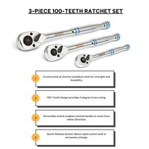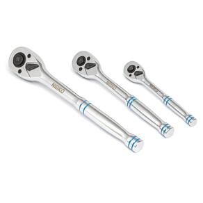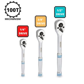 Neiko Conjunto de chave catraca de liberação rápida 03000A de 100 dentes, catracas de 1/4 polegada, 3/8 polegadas e 1/2 polegada, balanço de 3,6 graus, aço CrMo, conjunto de 3 peças - Conjunto de chave de soquete de catraca: com uma catraca de 1/10.2 cm, uma 3/20.3 cm e uma catraca de 1/5.1 cm, nosso conjunto de 3 peças de chaves catraca oferece alavancagem e potência de giro em qualquer espaço pequeno e apertado. A alça de aço cromo-vanádio garante que cada ferramenta dure por muito tempo. - Chaves de catraca duráveis: cada chave catraca rotadora totalmente polida possui uma cabeça de gota e é feita de um material CrMo forte. Nossas ferramentas fornecem um arco de giro de 3,6 graus para girar rapidamente em qualquer lugar, tornando-as ideais para reparos de carro ou casa. - Engrenagem de catraca de dupla direção: essas chaves catracas de aço têm um interruptor para frente e para trás para mudanças de direção rápidas e fáceis. O botão de liberação rápida em cada chave torna possíveis trocas de soquete com uma mão com o toque de um polegar! - Fácil de usar: a chave catraca de 100 dentes oferece acesso suave e precisão com movimentos mais rápidos, tornando-a uma ótima catraca rotativa para áreas apertadas. Além disso, a alça de fácil aderência oferece alavancagem extra sobre seus fixadores sem causar fadiga nas mãos. - Armazenamento conveniente: resistente e preciso, este pequeno conjunto de chaves soquete vem em uma bandeja de armazenamento de espuma EVA para fácil acesso e armazenamento, não importa o tipo de trabalho. Ideal para trabalho automotivo, é uma adição útil para coleções de ferramentas domésticas ou profissionais.