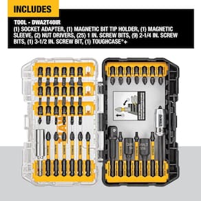 DeWALT 40-piece Impacto Pronto Parafuso conjunto de condução - Connectable accessory storage system to optimize storage space of the drill bits set - Patented bit-bar design of DEWALT bit set allows easy removal of bits and customizable placement - Clear lid of the driver bit set allows you to easily see contents at glance - Clip latch for secure closing - Small Bulk Storage size fits inside the Small and Medium ToughCaseplus (sold separately) - Ideal for organizing loose bits - CNC-machined bit tip for precise fit in screw heads for reducing cam-out - Extended FlexTorq Zone transfers optimal torque - Magnetic Screw Lock sleeve minimizes drops and reduces wobbles - FlexTorq allows bits to flex up to 15 degrees - 10x Magnetic Screw Lock system - Minimizes drops and reduces wobbling - Reduces breakage and longer life