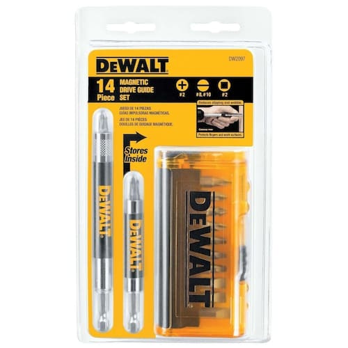 Conjunto de chaves de fenda DEWALT, guia de acionamento magnético, 14 peças (DW2097CS), pacote com 1 - A bucha guia autorretrátil protege os dedos e mantém os parafusos no lugar, eliminando oscilações e escorregões - Mantém os parafusos no lugar - Elimina oscilações e escorregões - Segura brocas de chave de fenda de 1 polegada para acionar parafusos em uma variedade de materiais