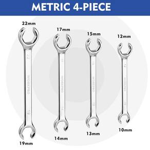 Conjunto de chaves de porca alargada WORKPRO de 4 peças, chaves métricas de linha de freio 10, 12, 13, 14, 15, 17, 19, 22 mm, aço Cr-V, chave de tubulação de cabeça deslocada de 15°, bolsa organizadora incluída - CONJUNTO VERSÁTIL: conjunto de ferramentas profissionais suporta 8 tamanhos comuns de porcas alargadoras — 10 x 12 mm, 13 x 15 mm, 14 x 17 mm, 19 x 22 mm, tamanho de marcação nas duas extremidades da chave para facilitar a identificação; boa para remover ou substituir porcas em linhas de freio de combustível ou ar condicionado - MATERIAL DE ALTA QUALIDADE: A chave de porca alargada WORKPRO é feita de aço cromo-vanádio tratado termicamente. Essas chaves são projetadas para durar e durabilidade; o acabamento cromado espelhado oferece resistência à ferrugem, abrasão e corrosão, aumenta a vida útil - 6 pontos: o design clássico de 6 ângulos se encaixa melhor nos cinco lados do fixador, o que proporciona uma aderência firme e mais pontos de contato; é mais adequado para todos os tipos de acessórios hexagonais de automóveis e tubulações - DESIGN OFFSET DE 15°: O design offset de 15° da cabeça em ambas as extremidades é ergonômico e oferece espaço para juntas É conveniente para trabalhar em áreas de difícil acesso ou espaços apertados - ARMAZENAMENTO CONVENIENTE: O conjunto de chaves está equipado com uma bolsa organizadora portátil para fácil organização e armazenamento, 4 bolsos compactos são bastante adequados para cada chave; esta bolsa organizadora permite que você a pendure na cintura para facilitar o acesso