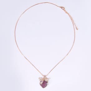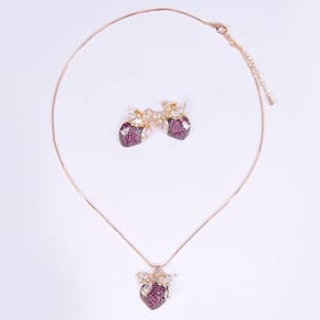 Conjunto composto de colar com pingente e brincos em formato de morangos, banhados a ouro cravejados de microzircônias cristais e coloridas. É delicado e luxuoso que te deixa em destaque em qualquer situação.