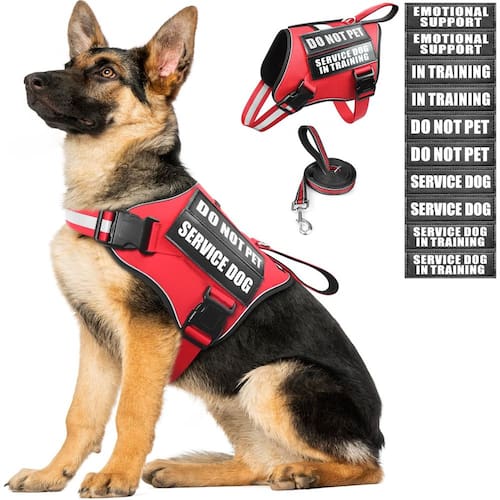 O pacote vem com um arnês para cães de serviço, uma coleira para cães de 1,5 m com 2 alças acolchoadas macias,
