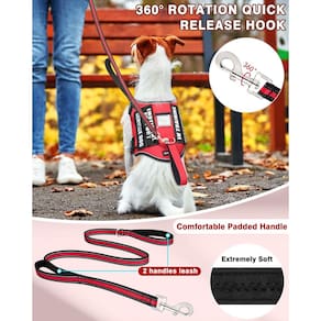 - Conteúdo da embalagem: ?O pacote vem com um peitoral para cães de serviço, uma coleira para cães de 1,5 m com 2 alças acolchoadas macias, 1 cartão de nome, 10 adesivos brilhantes de fecho aderente para cães (que brilham no escuro) como "NÃO ANIMAL DE ESTIMAÇÃO", "EM TREINAMENTO", "SERVIÇO DOG IN TRAINING", "SERVICE DOG IN TRAINING", "Service Dog" e "EMOTIONAL SUPPORT". Você pode preencher as informações do seu cão no cartão e colar 4 adesivos de cada vez para expressar a personalidade, o humor do seu cão ou para exibir informações úteis em seu arnês.