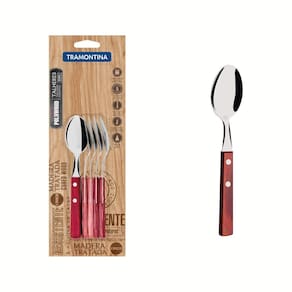 O Conjunto de Colheres para Chá Tramontina com Lâminas em Aço Inox e Cabos em Madeira Polywood Vermelho 6 Peças é perfeito para você juntar as amigas e realizar um delicioso chá da tarde em seu jardim. Os talheres apresentam grande durabilidade e resistência por serem produzidos com lâminas em aço inox e ainda possuem cabos de madeira tratada Polywood que combinam com ambientes rústicos e oferece a beleza que seu dia tanto merece. Com a Tramontina, você tem os melhores itens para sua casa! Orientações As lâminas de aço inox contam com maior espessura e uma estampagem do aço que garante maior resistência, evitando deformações. Os cabos de madeira tratada Polywood são resistentes à impactos e alta temperaturas garantindo maior resistência e durabilidade. Rebites de alumínio. Podem ir à máquina de lavar louças facilitando seu dia a dia. Características Gerais EAN13 7891112108257 DUN14 17891112108254 NCM 8215.99.10 Peso Líquido 0,1350 kg. Peso Bruto 0,1550 kg. Metragem 0,000809 m³. Dimensões Embalagem (Compr. X Larg. X Alt.) 28x 105x 275 mm. Cor 1 93272C Hexa Observações Antes da primeira utilização, lave bem as peças e seque-as. Tenha cuidado ao manusear produtos cortantes e perfurantes e mantenha-os fora do alcance de crianças. Para maior durabilidade dos produtos, recomenda-se secar bem antes de guardar, mesmo após lavagem em máquina.Para descarte dos produtos e embalagens siga as orientações de reciclagem vigentes.