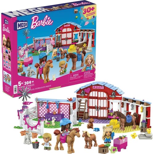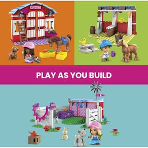 Conjunto de construção de brinquedos para cavalos Mega Barbie Pets com 3 microbonecas e acessórios, 9 animais de estimação, conjunto de brinquedos Horse Stables fácil de construir, - O conjunto de construção vem com 3 microbonecas Barbie, 9 animais, 290 tijolos de construção, incluindo peças e acessórios especiais, e 2 placas de base em forma de coração para construir - Inclui 14 acessórios de moda para personalização - Jogue enquanto constrói o jardim, o celeiro e os estábulos que incluem acessórios de RPG, como uma cenoura, fitas, pincel e muito mais - Combine com o conjunto de construção MEGA Barbie Horse Stables para mais maneiras de brincar com seus cavalos - Ideal para maiores de 4 anos, este brinquedo de construção oferece experiências de construir e brincar e contar histórias para desenvolver a criatividade e as habilidades de resolução de problemas.