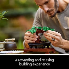 - Modelo de árvore de bonsai - Apresenta um modelo de árvore de bonsai LEGO com vaso retangular e suporte com efeito de madeira ripada, projetado para construtores adultos - Mindful Cherry Blossom - In Neste conjunto LEGO para adultos, os designers criaram uma construção cuidadosa com um padrão exclusivo de flor de cerejeira que se transforma em pequenos sapos para se divertir