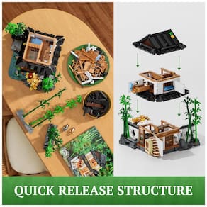 O modelo é modular: seções de bambu e partes do terreno podem ser removidas para montar paisagens menores de mesa ou facilitar o acesso ao interior. Cada piso pode ser destacado rapidamente, permitindo explorar os cômodos internos, observar o espaço secreto escondido atrás de um armário e reposicionar minifiguras e acessórios sem desmontar toda a construção.??