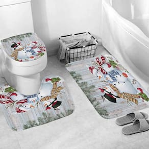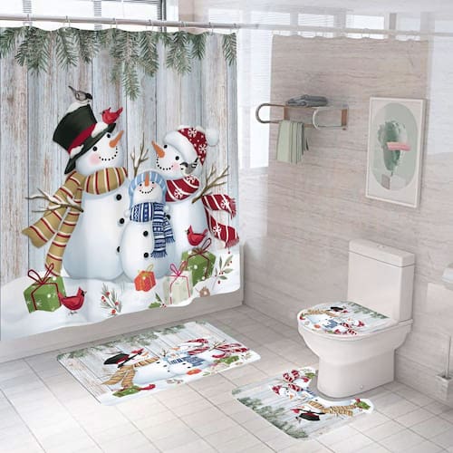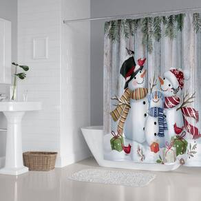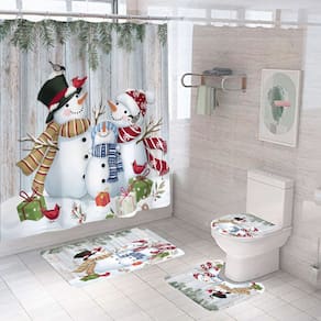 Tamanho do tapete antiderrapante: 45* 39 cm; tamanho do tapete de banho: 75* 45 cm; tamanho do assento do vaso sanitário: 38* 42 cm; tamanho da cortina de chuveiro: 180* 180 cm; peso: 800 g; material: poliéster; cor: igual à primeira foto; pacote: 1 x tapete antiderrapante, 1 x tapete antiderrapante de banheiro, 1 x assento de vaso sanitário, 1 x cortina de chuveiro • Tecido de poliéster de alta qualidade — A cortina de chuveiro é feita de poliéster durável que oferece um corte suave, clareza de cores vibrantes e desempenho duradouro em banheiros úmidos. • Arte encantadora de bonecos de neve — apresenta uma alegre família de bonecos de neve com cachecóis, cardeais, folhas de pinheiro e caixas embrulhadas, criando uma atmosfera acolhedora e festiva de inverno. • Conjunto completo de decoração de banheiro de 4 peças — Inclui cortina de chuveiro, tapete antiderrapante, tapete de banho absorvente e tampa de vaso sanitário para um estilo de decoração sazonal coordenado. • Impermeável e fácil de cuidar — A superfície repelente à água da cortina ajuda a limitar o acúmulo de umidade e mantém o banheiro mais fresco; todas as peças são fáceis de lavar e manter. • Suporte antiderrapante para maior estabilidade — Ambos os tapetes incluem fundos antiderrapantes projetados para aumentar a segurança e o conforto nos pisos dos banheiros.