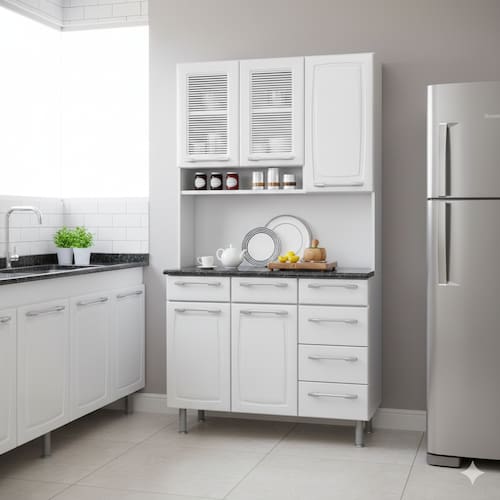 A Cozinha Prisma conta com seis portas, sendo duas com vidro serigrafado que dão um toque de charme para a estética, três gavetas com corrediças telescópicas que garantem um abrir e fechar mais suave e trava para impedir quedas, além de três prateleiras bem distribuídas para uma maior organização para a cozinha.