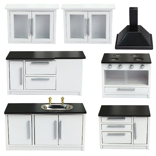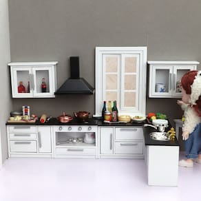Dimensões: pia: 12,4 x 5 x 6,1 cm; fogão: 8 x 5 x 6,1 cm; mesa (L): 12,7 x 5 x 6,1 cm; mesa (curta): 8,4 x 5 x 6,1 cm; armário de parede: 8,9 x 3 x 6,3 cm; exaustor: 7 x 4,5 x 6,2 cm; material: madeira Peso: 500 g Conjunto de cozinha completo: este conjunto de 7 peças inclui pia, fogão, mesa de jantar, armários de parede, exaustor e acessórios adicionais, perfeitos para equipar uma cozinha de casa de bonecas. Construção em madeira de alta qualidade: feito de madeira durável, este conjunto de móveis de cozinha adiciona charme e funcionalidade realistas às cenas de sua cozinha em miniatura. Projetado para casas de bonecas em escala 1:12: ideal para uso em casas de bonecas em escala 1/12, este conjunto de cozinha se encaixa perfeitamente em seus teatros em miniatura ou dioramas de cozinha. Não é um brinquedo para crianças: observe que este é um modelo em miniatura destinado a colecionadores adultos ou crianças mais velhas. Mantenha fora do alcance de crianças pequenas devido a peças pequenas que podem representar risco de asfixia. Perfeito para brincar de fingir: aprimore sua coleção de casas de bonecas com este conjunto de cozinha detalhado, ideal para brincadeiras criativas e para desenvolver a imaginação de crianças e colecionadores.