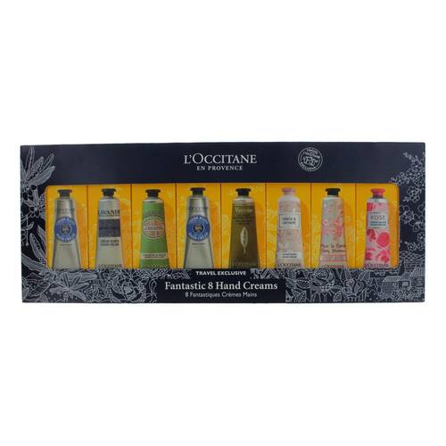 Este conjunto inclui rosa, flor de cerejeira, 2 vezes manteiga de karité, néroli e orquídea, amêndoa deliciosa, lavanda e refrigeração de verveina. Todos são cremes para mãos de 1 onça.