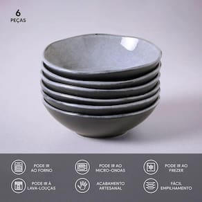 Design rústico e elegante para sua mesa Inspiradas nas texturas naturais do pó, essas cumbucas apresentam um acabamento texturizado em um tom preto sofisticado, perfeito para criar mesas que vão do casual ao contemporâneo. Com seis peças, este conjunto atende às necessidades de famílias ou grupos de amigos, garantindo estilo e praticidade em todas as refeições.