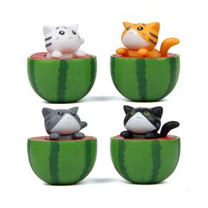 Material: PVC Tamanho: 4,5 × 5 × 5 CM Peso: 20 g ['Adorável design de melancia: este conjunto apresenta 4 gatos fofos sentados em vasos de melancia vibrantes, trazendo um toque divertido e divertido ao seu jardim, pátio ou espaço interno. ', 'Material de PVC durável: Feitas de PVC de alta qualidade, essas figuras em miniatura são resistentes às intempéries e perfeitas para uso externo e interno. ', 'Ideal para micropaisagismo: ótimas para jardins de fadas, terrários, vasos de plantas e decoração de bricolage, essas figuras de gatos adicionam personalidade e criatividade a pequenos espaços. ', 'Compacto e fofo: cada boneco mede 4,5 × 5 × 5 cm, o que os torna perfeitos para decorar mesas, jardins ou peitoris de janelas sem ocupar muito espaço. ', 'Decoração versátil: esses encantadores enfeites para gatos são perfeitos para adicionar personalidade à decoração de jardins, prateleiras domésticas ou displays temáticos, trazendo alegria a qualquer canto.']