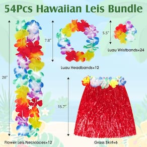 * Cores: cores mistas e cores sólidas * Quantidade: 54 peças * Aplicações: Nosso pacote de decorações de festa luau é bonito e funciona muito para muitas ocasiões, como decorações de festa havaiana, suprimentos de festa luau, decorações de festa tropical, decorações de festa na praia, decorações de festa aloha, dança temática havaiana, chuveiro com tema luau, saudação lei e assim por diante! Os convidados certamente vão gostar de usar leis para festas de luau. Estas saias havaianas Lei e grama são ótimas para uso.