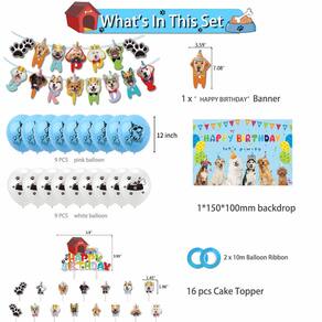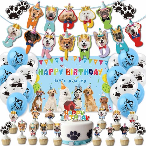 Conjunto completo para festas para cães — Inclui balões azuis para patas, banner com rosto de cachorro, pano de fundo, coberturas de bolo, fitas e inserções de cupcake, criando uma atmosfera alegre para o dia especial do seu cachorro. Materiais de alta qualidade — Feitas de látex durável e papel ecológico, as decorações são seguras, não tóxicas e adequadas para eventos de aniversário internos e externos. Fácil de montar — vem com 18 balões azuis e brancos, faixa para cães e 2 fitas planas; a configuração simples garante um arranjo de festa divertido e fácil. Adorável tema para animais de estimação — Projetado com imagens fofas de cachorros, estampas de patas e cores vibrantes, perfeito para eventos de aniversário de cães pequenos ou reuniões com animais de estimação. Reutilizável e leve — Pesando apenas 300 g, este conjunto é fácil de armazenar e reutilizar para várias celebrações, adicionando alegria duradoura a cada festa de cachorros.