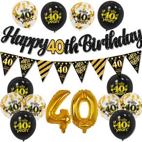 Conjunto completo de 40 anos: inclui balões numéricos de alumínio de 32", um banner de “Feliz 40º aniversário”, balões de látex pretos e dourados com estampas de confete, perfeitos para comemorar este ano marcante. Materiais de qualidade premium: feitos de látex e papel alumínio duráveis, esses balões e decorações são projetados para durar durante toda a celebração. Tema elegante em preto e dourado: a combinação impressionante de detalhes em preto, dourado e cintilante cria uma atmosfera luxuosa e elegante, ideal para uma memorável festa de 40 anos. Configuração fácil: inclui todos os acessórios necessários, como pontos de cola e anéis de balão, tornando a configuração simples e descomplicada, para que você possa se concentrar em aproveitar a festa. Decoração versátil: perfeita para festas de aniversário marcantes, aniversários e outros eventos importantes, adicionando um toque de elegância e sofisticação à sua celebração.