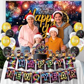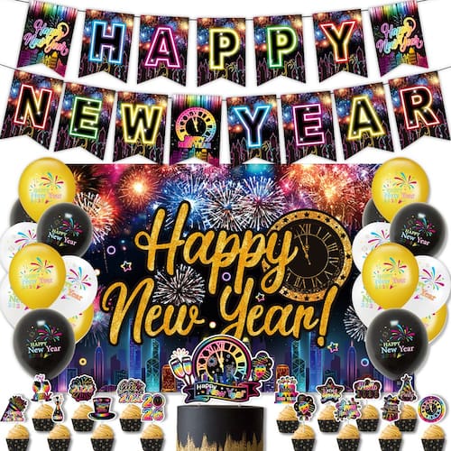 Kit completo de decoração de Ano Novo: inclui pano de fundo de fogos de artifício, banner de “Feliz Ano Novo”, 18 balões, 16 coberturas de cupcake e fitas — perfeito para criar uma configuração festiva completa. Design de néon atraente: apresenta um horizonte urbano colorido com fogos de artifício e letras em estilo neon, adicionando energia vibrante às festas e celebrações em contagem regressiva. Material premium: feito de látex grosso, tecido durável e papel de alta qualidade — reutilizável, não tóxico e adequado para decoração interna e externa. Fácil configuração e uso versátil: as fitas pretas incluídas facilitam pendurar faixas ou amarrar balões. Ideal para decorar paredes, mesas de sobremesas ou cenários fotográficos. Perfeito para a festa de Ano Novo de 2026: adicione uma atmosfera moderna e alegre a residências, escritórios, bares ou locais de eventos com este kit de comemoração elegante e coordenado.