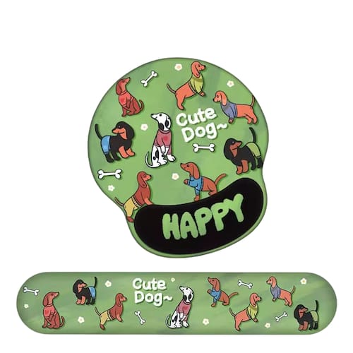 Material: silicone e tecido de seda leitosa Tamanho: mouse pad 223* 184* 23 mm; bandeja de teclado 440* 80 mm Peso: 350 g Suporte ergonômico de pulso — O mouse pad e o suporte para teclado apresentam acolchoamento de silicone macio que alivia a pressão do pulso, oferecendo uma posição confortável e natural das mãos durante o uso prolongado do computador. Design de cachorro adorável — Decorado com cães coloridos de desenhos animados e texto “Happy Cute Dog” em um fundo verde, adicionando um toque alegre e animado a qualquer espaço de trabalho. Superfície lisa de seda leitosa — Feita com tecido premium de seda leitosa para rastreamento suave do mouse e uma agradável sensação de toque, ideal para mouses ópticos e a laser. Base de borracha antiderrapante — A base durável mantém o mouse pad e o apoio de pulso firmemente no lugar, garantindo estabilidade e evitando movimentos indesejados em sua mesa. Perfeito para uso diário — mede 223 × 184 × 23 mm (mouse pad) e 440 × 80 mm (suporte para teclado), projetado para trabalho de escritório, estudo ou configurações domésticas casuais com suporte de pulso confortável.
