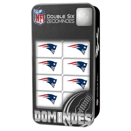 MasterPieces NFL New England Patriots Edição de colecionador Double Six Dominoes - Produto oficialmente licenciado pela NFL - Seis dominós duplos embalados em uma caixa de lata colecionável com janela - Inclui 28 dominós de resina com logotipo impresso do time e instruções de jogo - O jogo perfeito para todos os fãs de esportes! - MasterPieces - Uma empresa americana de quebra-cabeças e jogos; garantimos nossos produtos e sua satisfação