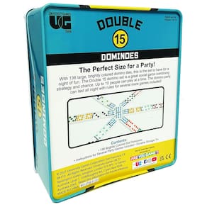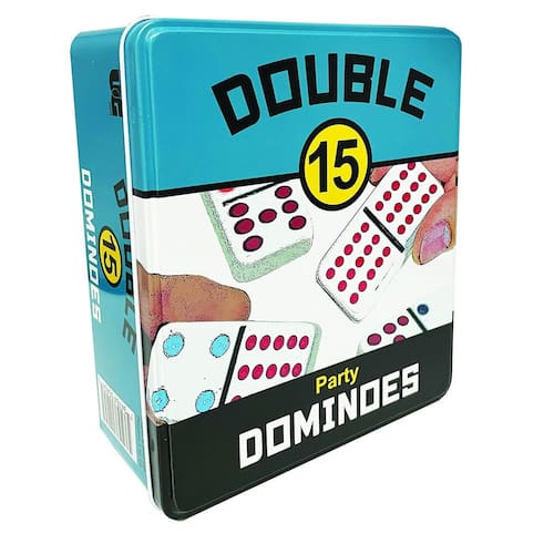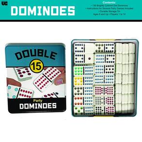 Front Porch Classics, Conjunto de dominó duplo de 15 pontos coloridos em lata para viagem, 2 a 12 jogadores de 8 a 99 anos - O conjunto de festas: este conjunto de festa extragrande inclui tudo o que você precisa para ter uma noite de jogo épica. - O que está incluído: 132 peças duplas clássicas o tornam o jogo social perfeito, combinando estratégia e chance com a capacidade de 10 jogadores de cada vez. Instruções incluídas para 10 jogos que certamente manterão a festa. - Alta qualidade, moderno, colorido: feito de materiais de alta qualidade, cada dominó é pintado com pontas coloridas e tem uma superfície lisa com cantos arredondados, dando o peso e o equilíbrio perfeitos em suas mãos. O recurso de pontos grandes facilita a leitura dos azulejos. - Jogos em movimento: a caixa de lata reutilizável permite fácil armazenamento e ótima para diversão em movimento. - A coleção Dominó University Games: oferece uma linha completa de dominós. Perfeito para todos os níveis de jogo, do novato ao profissional, estes dominós são os melhores classificados em qualidade e durabilidade.
