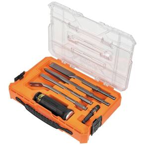 Klein Tools Conjunto de chaves de demolição SDS 32755SD com capa, alça de chave de fenda, extrator de unhas, barra de puxão, cinzéis SDS-Plus, para erguer, demolição e parafusos, 7 peças - Transmissão instantânea: transição fácil entre o prybar portátil e a broca de martelo rotativo - SISTEMA MULTIBIT: inclui puxador de unha hexagonal, furador, cinzéis SDS-Plus pontiagudos e planos e alça de demolição SDS-Plus universal - Tampa de ataque de metal superdimensionada: uma grande tampa de impacto de 3 cm de diâmetro para melhorar a mira ao martelar - Cabo de almofada com chama resistente: o cabo em forma de cogumelo oferece proteção para as mãos e evita o deslizamento da mão durante o uso - COLAR DE LIBERAÇÃO RÁPIDA: Trocas rápidas e fáceis entre as lâminas para realizar várias tarefas de demolição