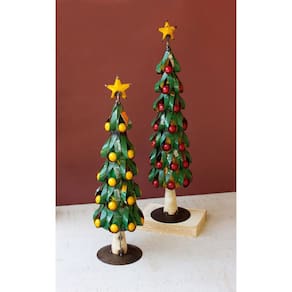 Conjunto de duas árvores de Natal de metal reciclado com maçãs e limões