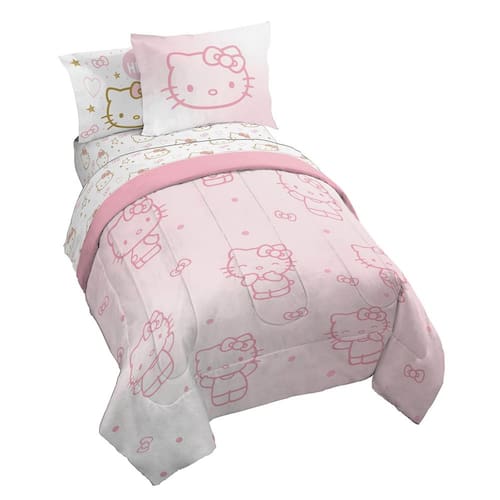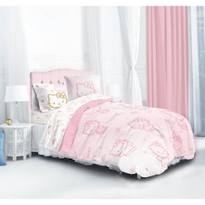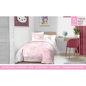 Transform your bedroom with this Hello Kitty twin bed set! This vibrantly colored bed set will dress up any bedroom décor, making you excited to jump into bed. This comforter is stuffed with light polyester fill for loft and cozy comfort all year round. The complete bedding set includes a 64 x 86 inch comforter ,a 66 x 96 inch flat sheet, a 39 x 75 inch fitted sheet, and a standard sham that measures 20 x 26 inches. To clean machine wash cold and tumble dry low.