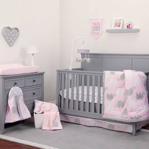 NOJO Dreamer - Conjunto de edredom de 8 peças com elefante rosa/cinza - Inclui edredom, 2 lençóis de berço estampados, babados de poeira, travesseiro estampado, empilhador de fraldas, cobertor de lã coral, capa de trocador - O edredom mede 91 x 114 cm; lençóis de berço 71 x 132 cm; babado de poeira 40 cm; travesseiro 25 x 35 cm; empilhador de fraldas 38 x 15 x 50 cm; cobertor 76 x 111 cm - Feito de mistura de poliéster/algodão; lençóis 100% algodão; cobertor 100% poliéster; capa de trocador 100% poliéster - Serve para berços tradicionais e conversíveis