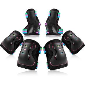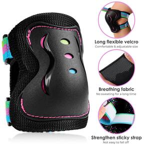 - Tecidos ventilados – o conjunto de joelheiras e cotoveleiras infantis BOSONER é feito de tecidos duráveis de alta qualidade, com enchimento de espuma EVA e tampas de cobertura total de policarbonato, que tem boa absorção de choque e efeito de amortecimento para reduzir os danos causados por quedas esportivas