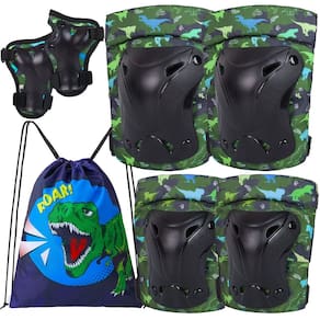 Marca: FIODAY Nome do produto: Joelheiras infantis 7 em 1 protetores de pulso com cotoveleiras conjunto de equipamentos de proteção com padrão de dinossauro Material: Revestimento de PP rígido e faixa de EVA respirável Detalhes de tamanho: Joelheiras: 16 x 14,5 cm cotoveleiras: 15 x 12,4 cm almofadas de pulso: 14,5 x 9,9 cm bolsa: 39,9 x 30 cm A embalagem inclui: 2 joelheiras. 2 cotoveleiras 2 protetores de pulso. 1 bolsa - Conjunto de equipamentos de proteção 7 em 1: o pacote inclui 2x joelheiras, 2x cotoveleiras, 2x protetores de pulso e 1x mochila com cordão; muito fácil de armazenar e carregar as almofadas de skate para qualquer lugar a qualquer momento e evitar perder qualquer um deles - Durável e confortável: o conjunto de joelheiras infantis é feito de revestimento de PP, que pode resistir a impactos; acolchoado com material EVA macio para amortecimento de impacto; forro de tecido respirável e design de superfície de malha fornecem um envolvimento respirável e confortável - Design de dinossauro fofo: estas almofadas de skate são projetadas com padrão de dinossauro atraente e fofo, que pode chamar a atenção de seus filhos; Ajuda a incentivar seu filho a praticar esportes; eles atrairão a atenção das pessoas, não importa onde seus filhos vão - Faixas elásticas ajustáveis: o tamanho pequeno é adequado para meninos de 3 a 8 anos, pesa 16 a 35 kg; as tiras elásticas ajustáveis garantem liberdade de movimento ao praticar esportes; as joelheiras e cotoveleiras são fáceis de usar; as crianças podem fazer isso sozinhas - Conjunto de equipamentos multiesportivos: as joelheiras e cotoveleiras infantis são muito adequadas para scooter, skate, mountain bike, patinação em linha, patinação, ciclismo e outros esportes; o conjunto de almofadas para crianças mantém nossos filhos longe de machucados quando gostam de esportes; é uma boa escolha como dia das crianças, Natal, aniversário, presente de feriado e outros presentes de festival.