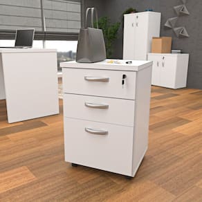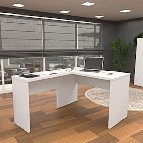Aumente a produtividade com este conjunto de móveis para escritório, composto por uma mesa em L espaçosa e robusta, um gaveteiro volante móvel e prático, um armário alto para armazenamento e um armário baixo para organização diária, tudo com design moderno e materiais de alta qualidade.