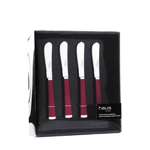 Conjunto De Espátulas Pastry 4 Peças Vermelha Haus Traga elegância e inovação para a sua mesa com este Conjunto de Espátulas Pastry. Composto por 4 Espátulas, são perfeitas para serem utilizadas com Patês, ou Geleias. Produzido em Aço Inox e Acrílico, a espátula tem a cor prata com cabo vermelho. Suas medidas individuais são: 15 cm x 1,7 cm 0,8 cm. Marca: Não Informado