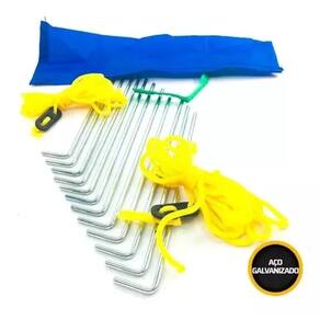 Dimensões: 18 cm + 2 cordinhas de 2,80 m Material: Aço galvanizado reforçado Tipo: Conjunto de Estacas+Cordinhas