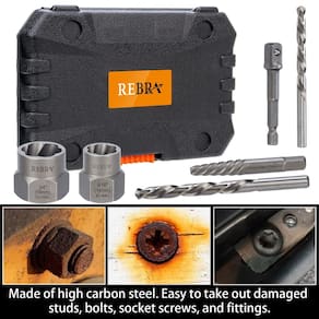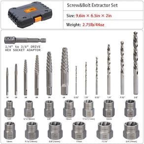 Conjunto extrator de parafusos e parafusos REBRA e conjunto de brocas à esquerda, com adaptador hexagonal, ferramenta de remoção de parafusos e parafusos Easy Out para parafusos, porcas e parafusos descascados, danificados, arredondados e enferrujados. 26 peças -?TAMANHO DO EXTRATOR DE PORCAS?: Esses extratores de parafusos e porcas de 14 peças funcionam em tamanhos métricos e SAE - 1/4", 5/16" (8 mm), 10 mm, 7/16" (11 mm), 12 mm, 1/2", 13 mm, 9/16" (14 mm), 5/8" (16 mm), 17 mm, 11/16", 3/4" (19 mm), com adaptador hexagonal de 3/8 “a 1/4" -?TAMANHO DO EXTRATOR DE PARAFUSOS E DO KIT DE BROCA?: Extrator de parafusos de 6 peças: 1 #, 2 #, 5 #, 4 #, #, 6#; Broca HSS esquerda de 6 peças: 3 /32 “, 1/8", 5/32", 1/4", 9/32", 3/8". Todas essas ferramentas estão claramente marcadas -?CONJUNTO DE BROCAS À ESQUERDA?: As brocas esquerdas deste conjunto extrator são feitas de aço de alta velocidade, são mais fortes do que as brocas à direita e não são fáceis de usar. O design angular de 135° da cabeça facilita o toque nos fixadores e garante o escareamento preciso e a limpeza suave do orifício -?POTÊNCIA DE FIXAÇÃO SUPERIOR?: Cada removedor de porcas é projetado com precisão. A ranhura em espiral reversa do soquete foi projetada para morder e fornecer máxima aderência. Quanto mais você gira, mais apertadas são as alças do soquete, para que ele possa remover facilmente porcas descascadas, enferrujadas, arredondadas ou congeladas -?SERVIÇO PREMIUM?: Estamos comprometidos em fornecer a cada cliente os melhores produtos e o melhor serviço. Se você tiver alguma dúvida sobre o produto, basta entrar em contato conosco por meio da plataforma Amazon. Temos uma equipe profissional para resolver isso para você!