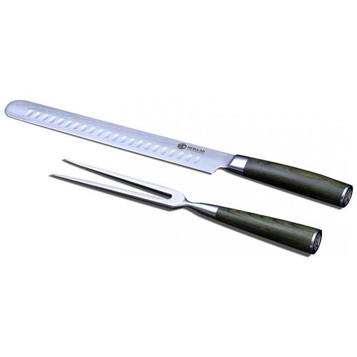 FACA DE ESCULTURA: 67 camadas de aço Damasco japonês: A lâmina da faca é feita de 67 camadas de aço Damasco japonês premium, proporcionando nitidez incrível e corte sem esforço de qualquer proteína. GARFO DE DOIS PONTOS: O garfo fino de aço inoxidável de duas pontas fornece uma aderência segura para fatiar e servir. DESEMPENHO E EFICIENTE: A ponta arredondada da faca ajuda a evitar perfurações acidentais na carne, preservando os sucos da carne para máximo sabor. ALÇAS ERGONÔMICAS PREMIUM: Este conjunto de escultura é perfeitamente equilibrado com alças de pakkawood verdes florestais fáceis de segurar para fatiar e servir de maneira uniforme, sem esforço e confiante. Faz uma declaração em qualquer cozinha VERSÁTIL: Faca perfeita para cortar fatias finas de carne, peru, presunto, lombo de porco e costela. Também funciona muito bem para fatiar frutas e vegetais grandes como abacaxi, melancia, abóbora, abóbora e berinjela Marca: Não Informado