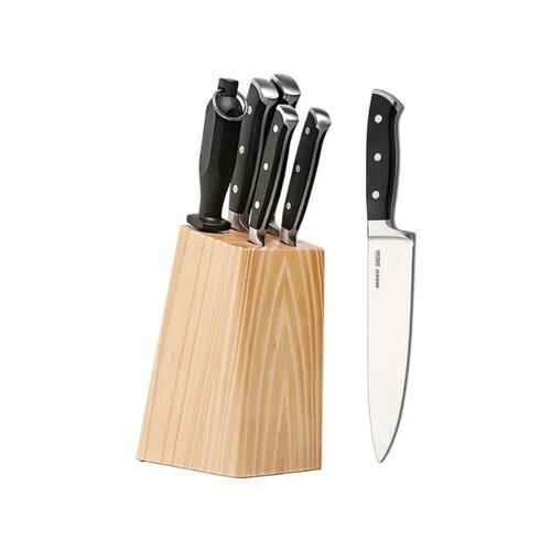 - 01 Faca Chef 8 01 Faca de Cozinha 8 01 Faca de Cozinha 5 01 Faca para Legumes 3 1/2 01 Chaira 8 Chaira 01 Cepo de Madeira 33x21x9 cm