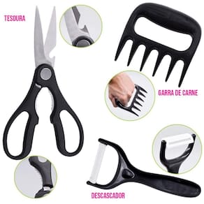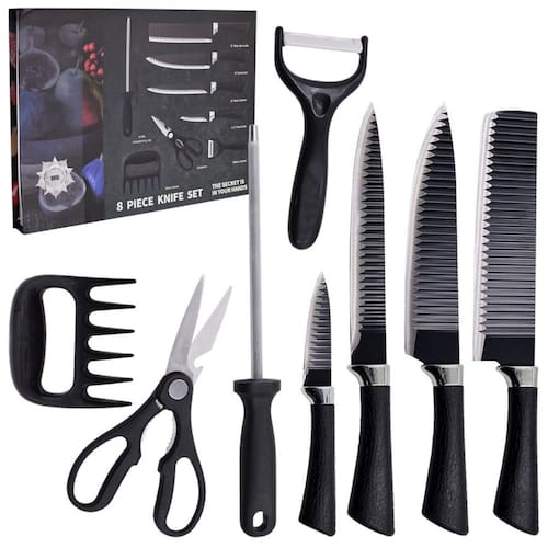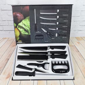 Itens inclusos: - 1 faca de corte de carne - 1 faca do chef - 1 faca de descascar - 1 descascador de legumes - 1 tesoura - 1 amolador de faca - 1 cutelo - 1 garra de carne Marca: Não Informado