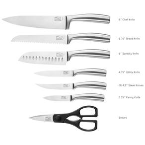 O conjunto de 16 peças inclui 8 polegadas Chef, pão serrilhado de 6 3 , 4 polegadas, Santoku de 6 polegadas, utilitário de 4 3 , 4 polegadas, aparar de 3 1 , 4 polegadas, oito facas de 4 1 , 2 polegadas, tesouras, bloco de madeira para assistência a cortes e manchas de ébano Facas contemporâneas e um belo bloco de madeira com acabamento preto distinguem esse conjunto de ferramentas de cozinha de alto desempenho As alças de aço inoxidável com contornos são elegantes e contemporâneas e cabem confortavelmente na mão aço inoxidável de alto carbono o aço cria uma lâmina mais forte e mais resistente para resistir a manchas, ferrugem e corrosão Borda cônica de moagem cônica de 26 graus para nitidez ideal, corte preciso e nitidez fácil Design forjado para maior peso e equilíbrio A espiga completa de metal fornece resistência, equilíbrio e controle Bloco de madeira de freixo com acabamento preto mantém as facas seguras e possui um apontador embutido para afiação simples e conveniente Lavagem das mãos e secagem imediatamente para manter as melhores condições Vida útil completa Componentes incluídos Facas, Bloco de facas de madeira Marca: Não Informado