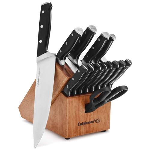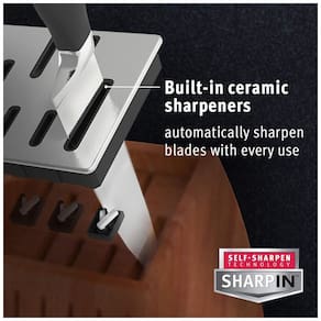 Afiadores de cerâmica embutidos afiam automaticamente facas de chef e outras facas de borda reta a cada uso Aço forjado, alto carbono, sem manchas facas para bife feitas de aço estampado Alças rotuladas para fácil identificação no bloco Alças rebitadas triplas são contornadas para uma aderência segura Full tang design para força e equilíbrio Marca: Não Informado