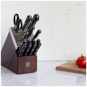 Elegante tampa de aço inoxidável escovado e bloco auto afiável com base em madeira de freixo tingida Feito sob medida para a série de facas JA Henckels International Classic Ranhuras auto afiáveis que se afiam cada vez que uma faca é removida ou substituída Os slots rotulados orientam o posicionamento adequado Marca: Não Informado
